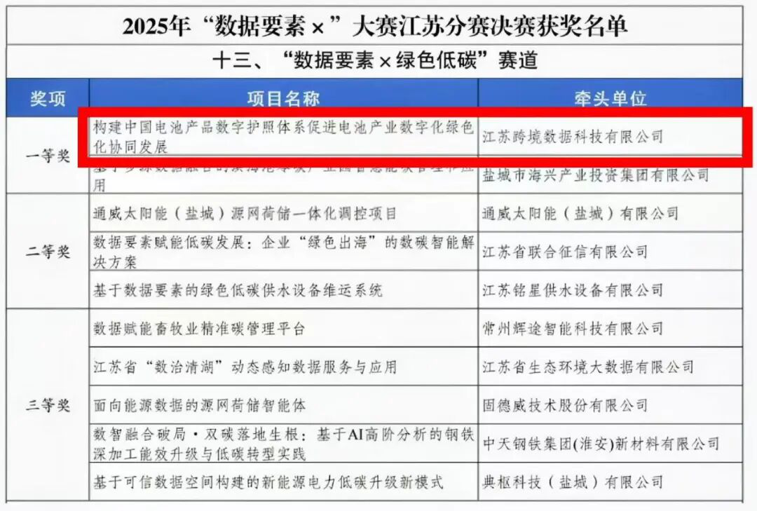 近期,2025年“数据要素×”大赛江苏分赛绿色低碳赛道比赛展开激烈角逐,江苏跨境数据科技有限公司(江苏国际数据港运营主体)的“构建中国电池产品数字护照体系促进电池产业数字化绿色化协同发展”项目在127支参赛队伍中脱颖而出,斩获一等奖荣誉,并顺利晋级全国总决赛!