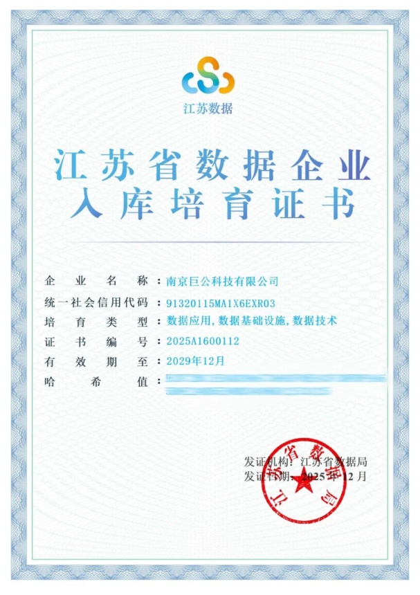 深耕领域多年,巨公科技的实力获得了行业与官方的双重认可,斩获了多项沉甸甸的荣誉:2025年江苏省第一批入库培育数据企业、2025江苏省公共数据“跑起来”案例、2025江苏公证十大典型案例、2024年“数据要素×”大赛江苏省分赛文旅赛道三等奖、2024年江苏省文旅厅全国智慧旅游推荐案例等。