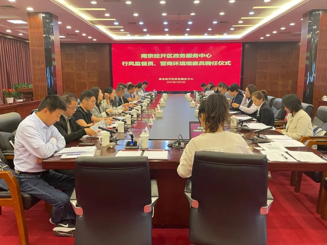 为加快推进政府职能转变,搭建政府与企业及社会各界沟通的桥梁,打造亲清政务服务,近日,南京经开区政务服务中心召开了行风监督员、营商环境观察员聘任仪式。经开区管委会副主任彭晶、行政审批局(政务服务中心)局长王青、机关党委书记孙涛、纪工委副书记刘建梅,新聘任的行风监督员和营商环境观察员,以及政务服务中心各进驻部门、单位相关负责人出席了仪式。