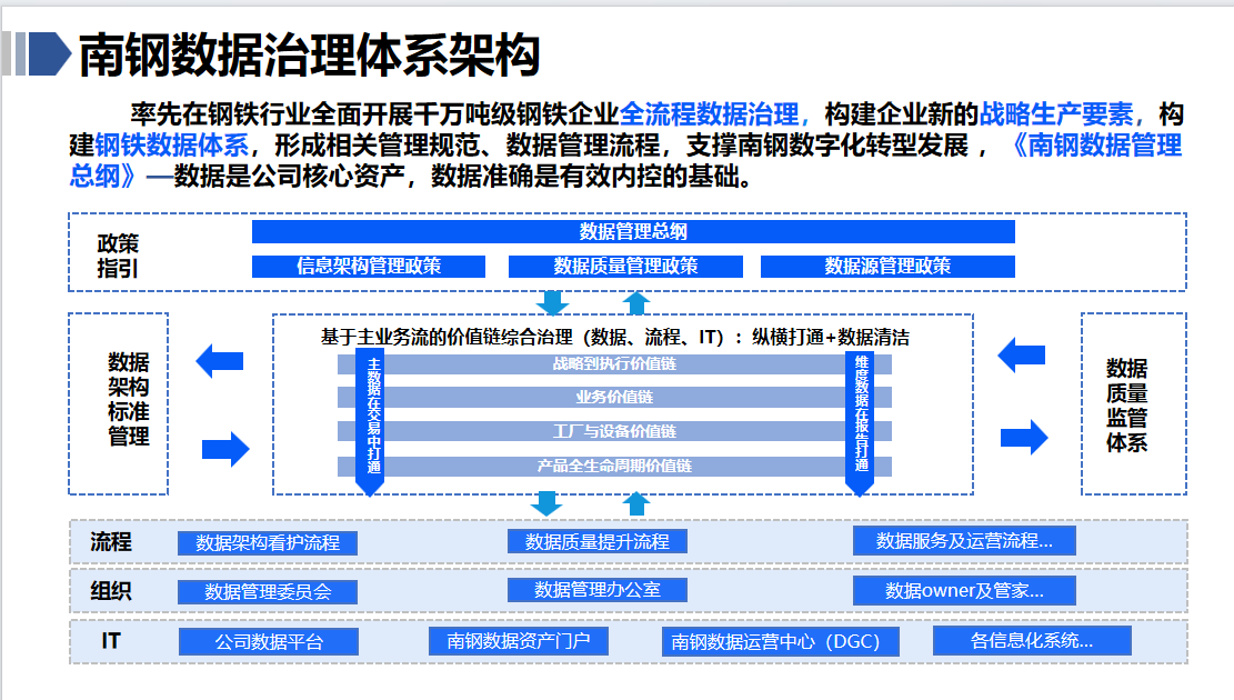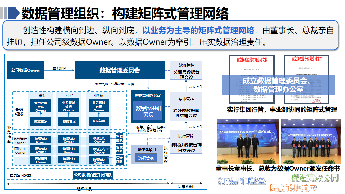 此外,南钢数字应用研究院结合数据治理、人工智能百景千模、重点场景应用等,对南钢数字化转型实践进行了讲解,并介绍了2024年“数据要素×”大赛中获得优异成绩的《基于数据要素驱动的钢铁产业链协同智慧运营平台》项目。南钢构建全场景全价值链数据治理体系架构,率先在钢铁行业全面开展数据治理,依托矩阵式管理网络,推动数据管理与生产经营管理深度融合。南钢专门成立数据资产中心,打造实时数据湖与数据仓库融合平台,为发挥数据乘数作用提供保障。