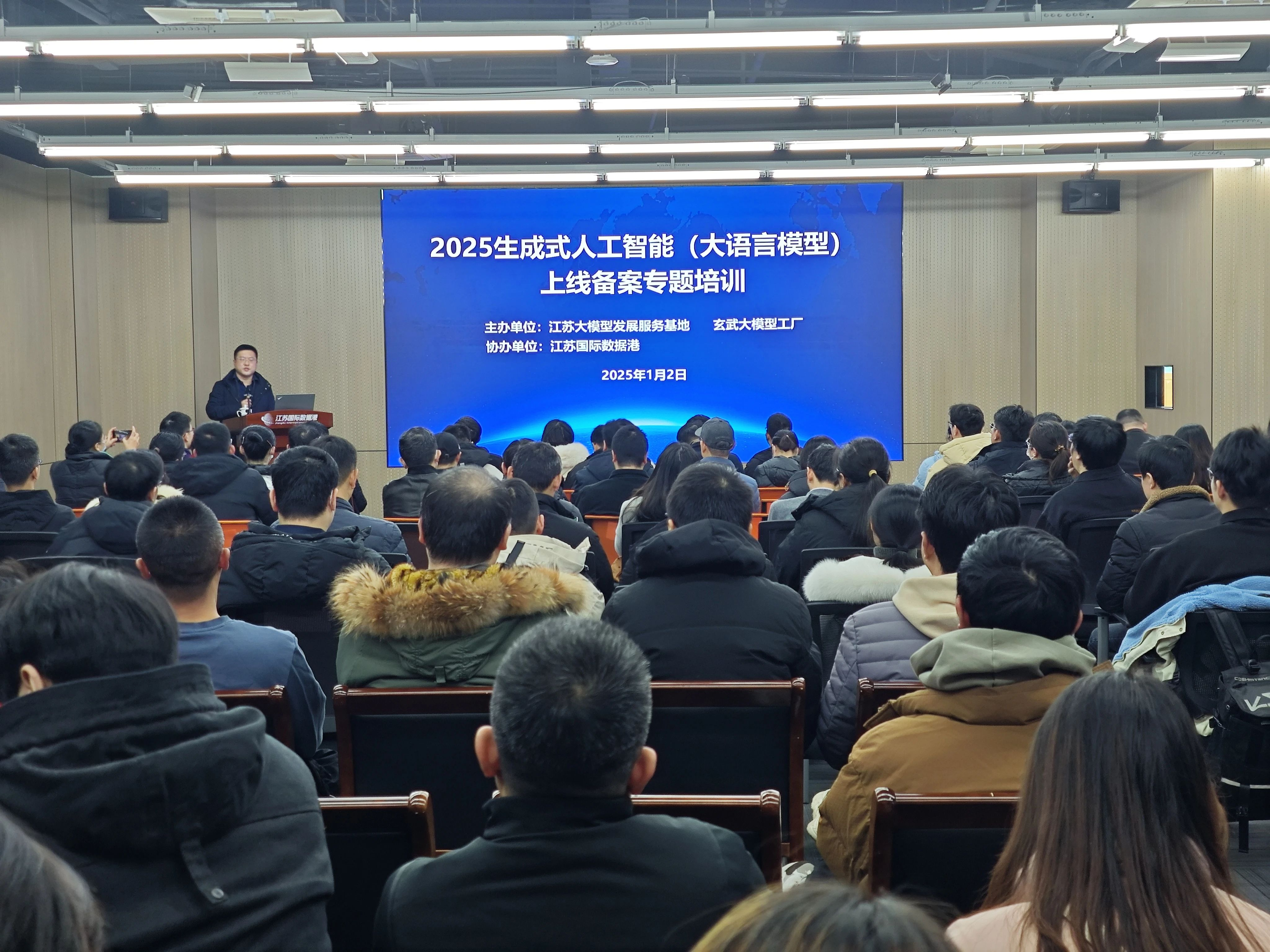 为落实省委网信办关于促进生成式人工智能健康发展的部署,加快在南京玄武区徐庄高新区建设江苏大模型发展服务基地,满足大模型企业合规发展的需求,营造大模型产业生态。近日,江苏大模型发展服务基地和玄武大模型工厂在江苏国际数据港举办2025年“生成式人工智能(大语言模型)上线备案”专题培训。