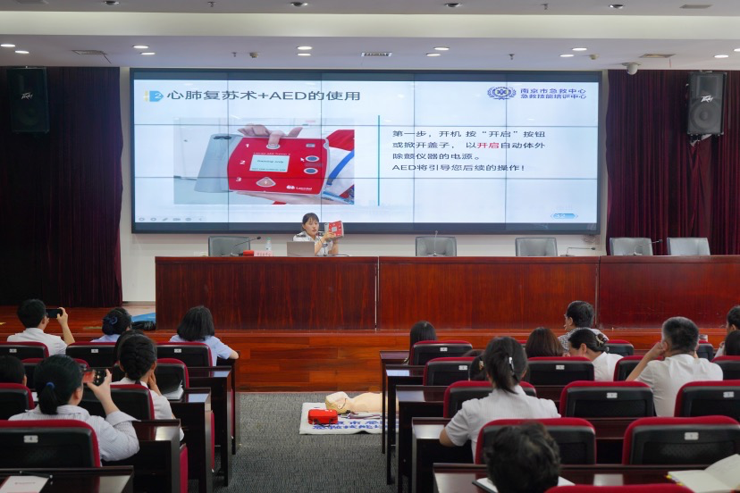 此次培训采取“理论培训+情景实操”相结合的模式,现场邀请了南京市急救中心专业老师进行授课。老师详细讲解了心肺复苏(CPR)知识、呼吸道异物阻塞排除等常见突发事件现场应对策略,重点讲解了AED的使用技巧和流程。现场,老师还利用人体模型在现场模拟示范如何运用心肺复苏抢救伤者,手把手教导大家如何利用身边有限的资源把握好救援的“黄金时间”进行应急救护。