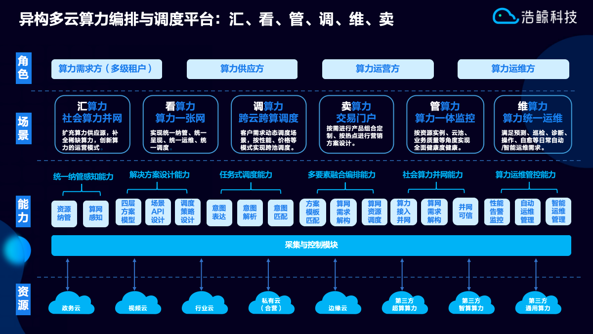 浩鲸科技异构多云算力编排与调度平台以“对内高效统管,对外可信交易”为核心,以智能调度和算网融合技术为基础,打造节能降耗、提质增效的先进算力调度平台,实现轻松业务配置、灵活资源编排、健康建议、自动化运维、算力统管等的效果,解决运营各方的快速算力并网、算力资源与业务质量可视可优化、算力高价值变现等核心诉求。平台适配对接国内外主流、异构多元、种类多样的算力资源(通用算力、超算、智算等),当前已落地共14个运营商案例、6个政企案例,为企业、政府、高校及科研单位提供丰富、便捷、普惠的算力服务。