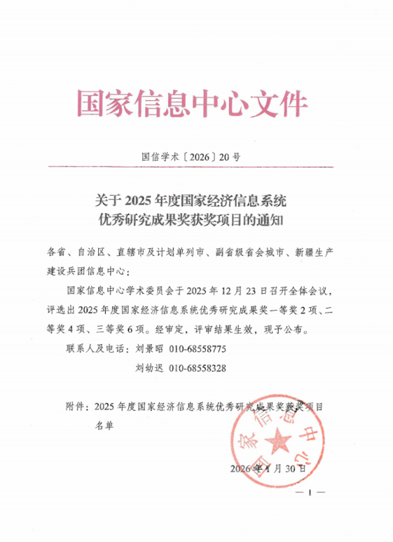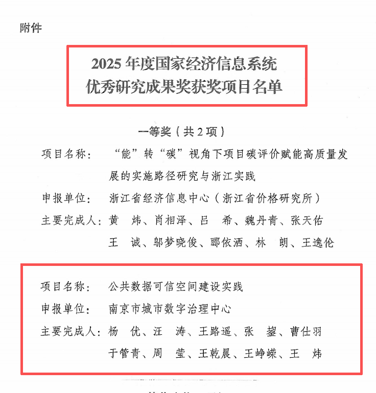 2026年1月30日,国家信息中心公布了2025年度国家经济信息系统优秀研究成果奖获奖名单。南京市城市数字治理中心报送的《公共数据可信空间建设实践》荣获一等奖。