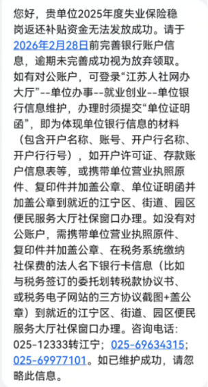 工作人员查看短信内容后,告知宋先生补贴未发放系银行账户信息未完善,补齐信息即可正常领取,并且如果现在提供营业执照、“委托划转税款协议书”(以下简称“三方协议”),当场就能在服务窗口维护单位银行信息。然而,2025年度失业保险稳岗返还补贴资金发放,需要单位于2026年2月28日前完善银行账户信息,逾期未完善成功视为放弃领取。