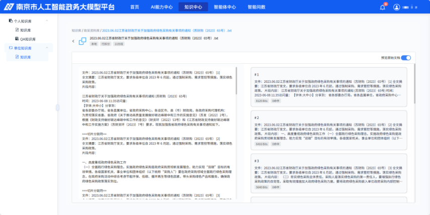 本次升级完成全维度知识体系重构,在原有知识库基础上延伸扩展,深度覆盖工程建设、政府采购、产权交易、国企采购、数据交易、内控管理等核心领域,构建对内、对外双维度专属知识库。通过对300余份政策文件、业务规范开展精细化摘要提取、标签标注,完成16000余片文档智能切片,实现知识颗粒度细化、领域精准划分,进一步强化“宁小招”智能理解和自主学习能力。